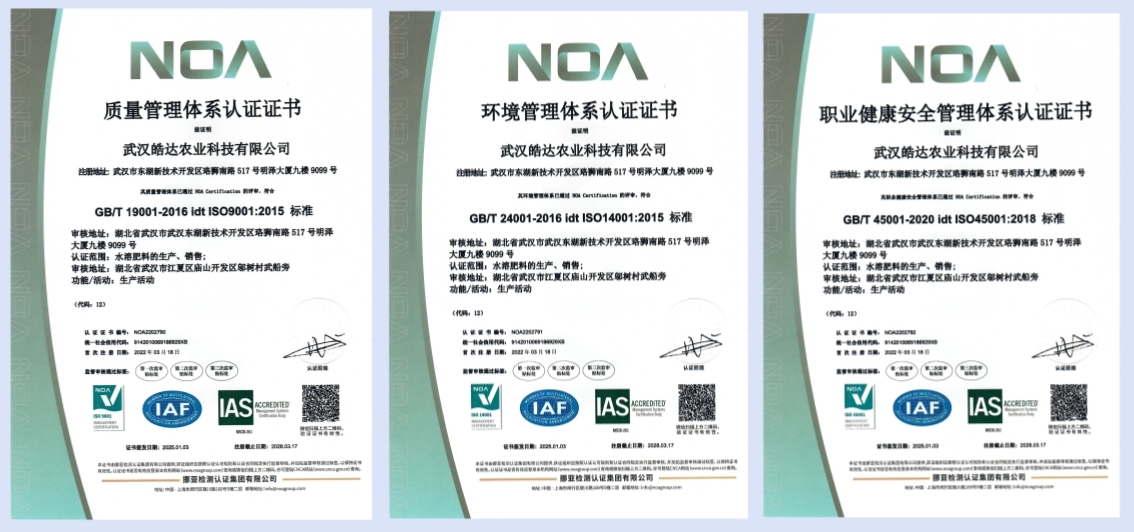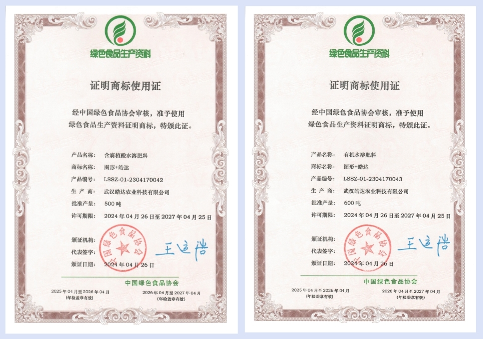 皓达有机水溶肥和皓达含腐植酸水溶肥均获得“绿色生产资料”证明商标使用证;