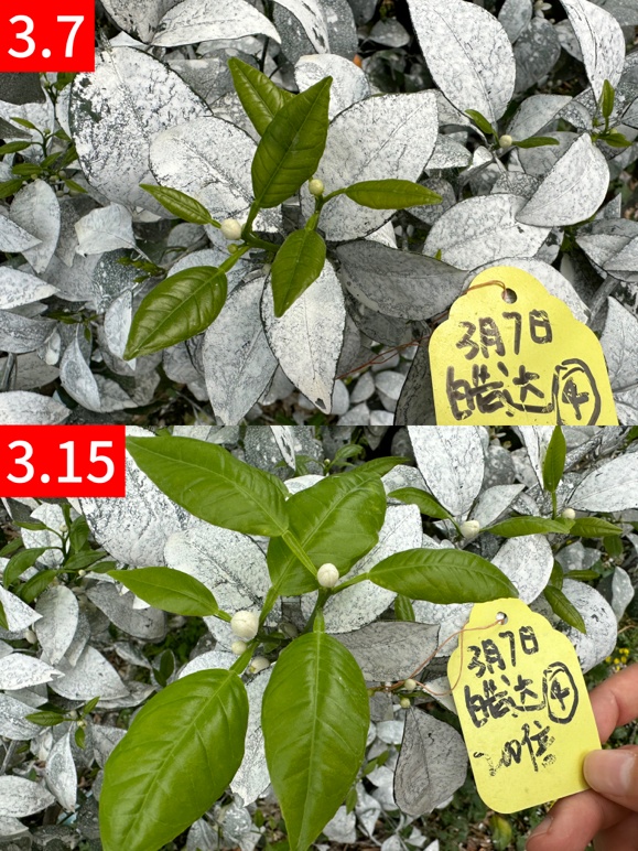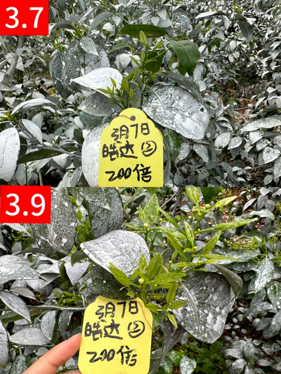 广西武鸣甘圩镇丹姐果园,一个用皓达年年赚钱的果园,花带叶比例大,于2026年3月7日使用皓达200倍液(单打,不可加农药)进行控旺壮花,3月9日回访:三天效果显而易见,春梢展叶快、花朵饱满健壮。叶片快速展开,转化为功能叶,可以进行光合作用,并为花和果提供养分。