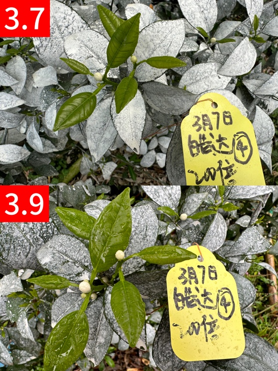 3月23日使用皓达500倍进行保果,为果快速补充营养。并于3月26日回访,叶片大张,基本老熟,厚绿油亮,幼果谢花即转绿。