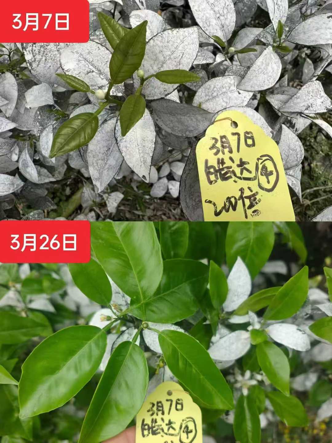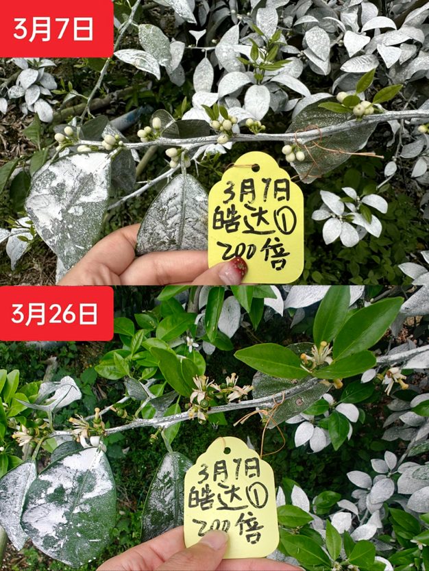 果园于3月12日第二次使用皓达200倍壮花,3月15日回访。加快叶片老熟程度,厚绿油亮,花朵盛开。