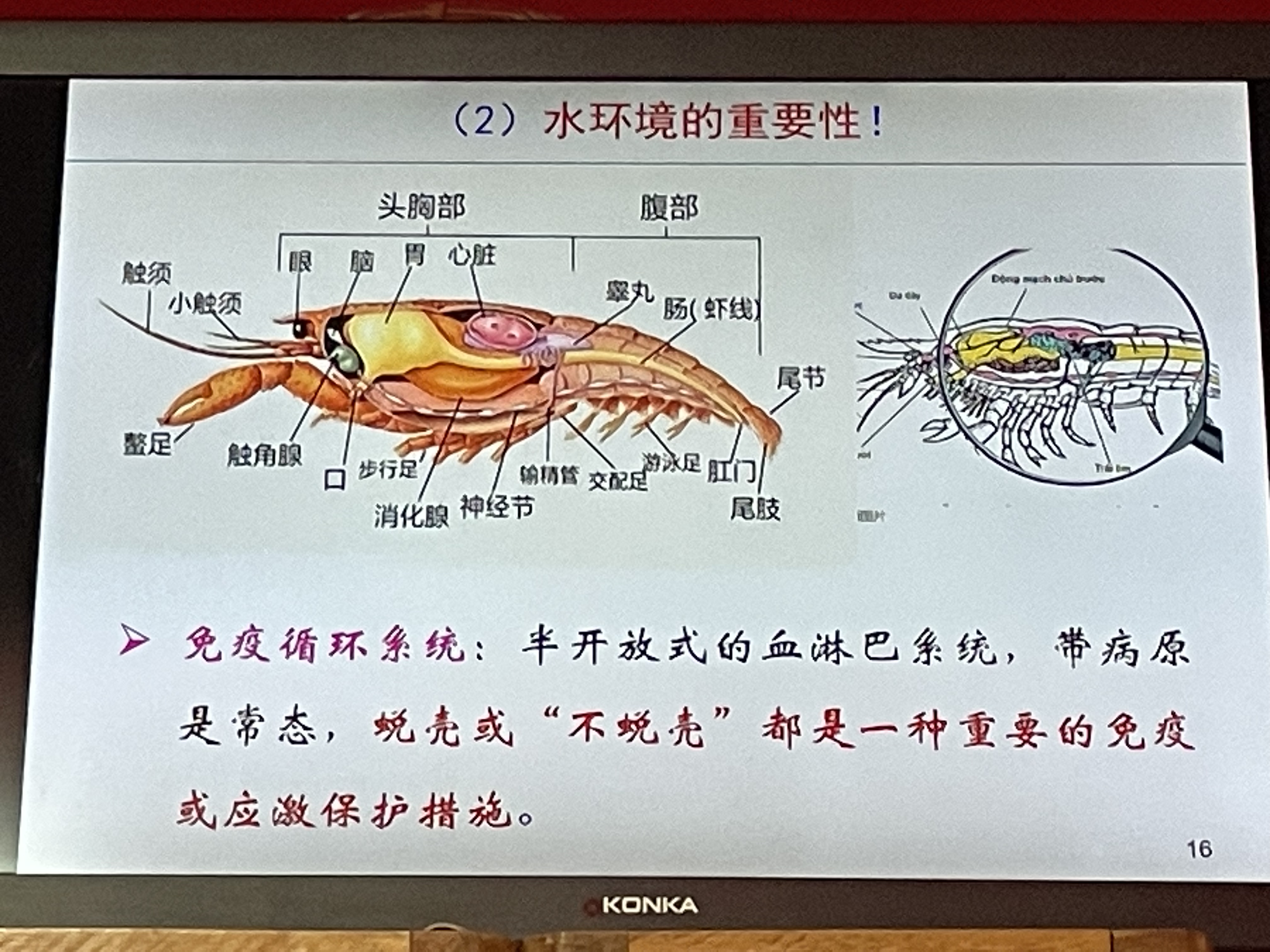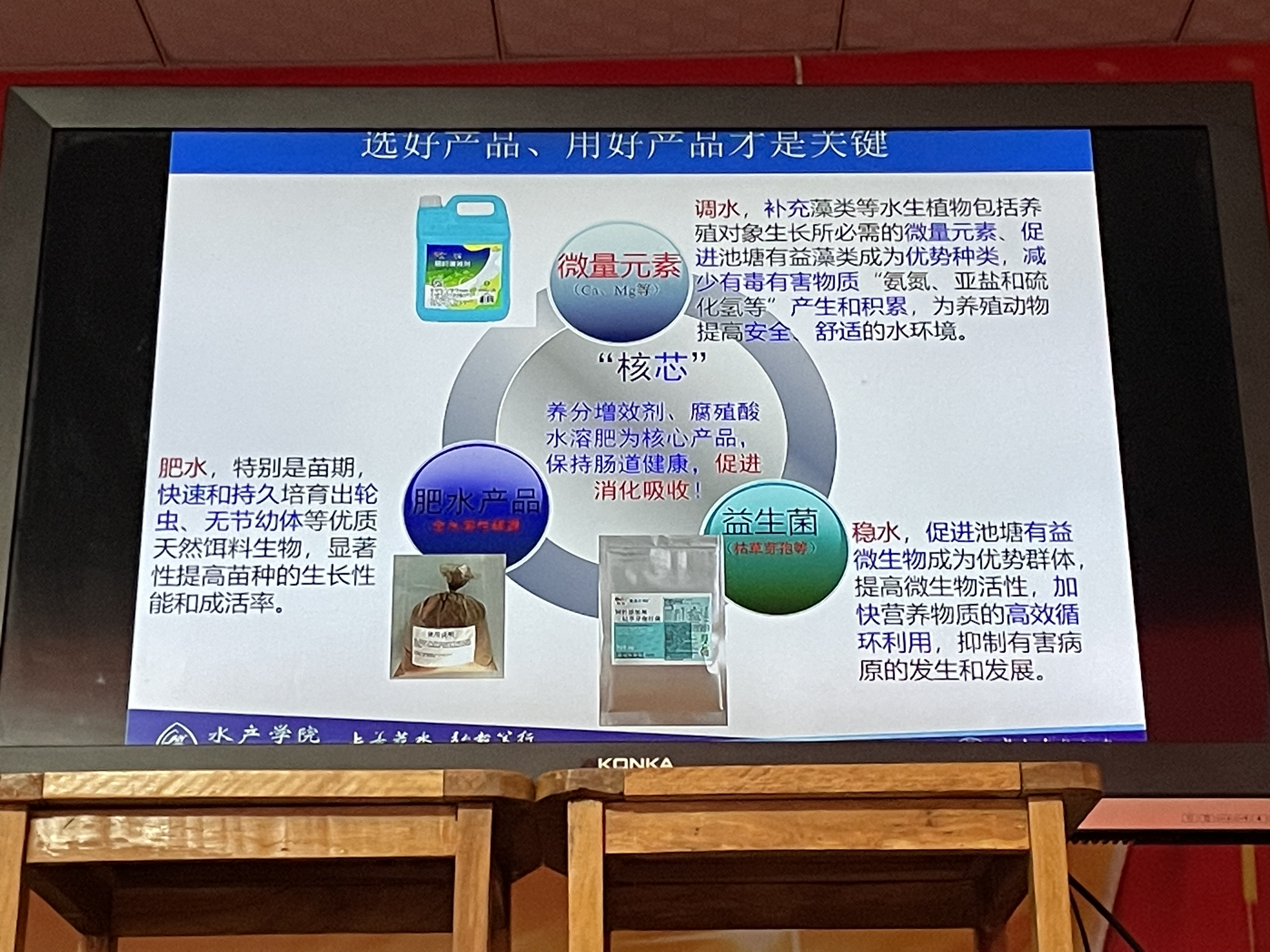 在如何调节水环境中袁教授着重介绍了皓达技术解决方案的三个功能性:①它可以很好的为养殖水里的藻和菌提供微量元素;②可以减少有害菌的滋生;③在养殖的高温季节或者养殖的中后期,补磷和碳。