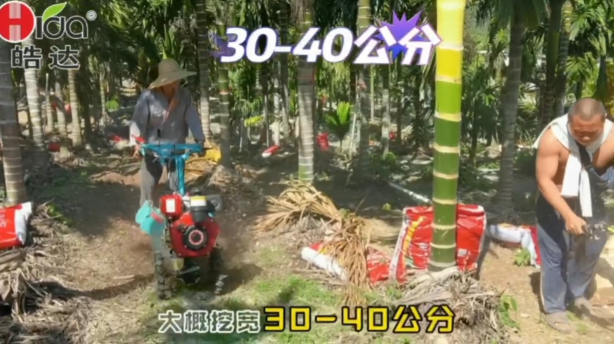 第一、槟榔下肥前怎么开沟?我们一般在叶片滴水线下,稍微往里一点大概挖宽30-40公分,深度大概是15-20公分。