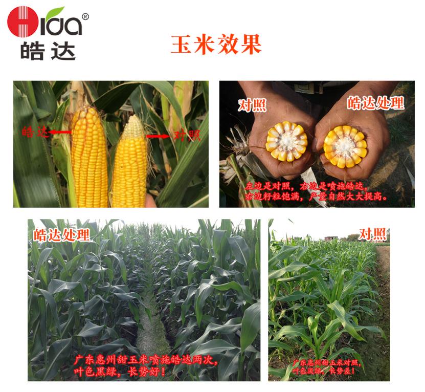 施肥时期:灌浆期 时期问题 干物质不易积累,籽粒不饱满,易秃尖,千粒重低; 施肥方案: 滴灌:滴灌:皓达功能肥100mL/亩(随大肥) 施肥效果: 增加干物质的积累和千粒重,玉米籽粒饱满,同时能有效减少玉米秃尖的产生,玉米颜色正,产量高。