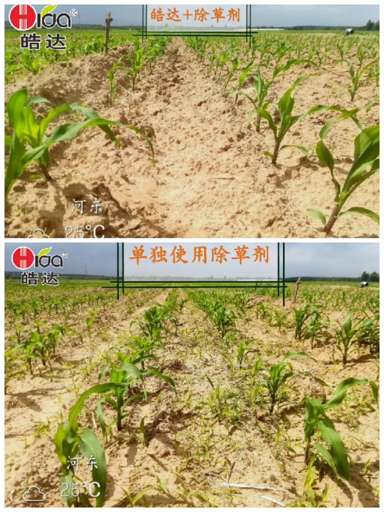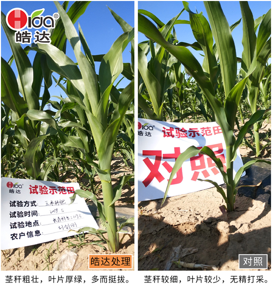 施肥时期:苗期 时期问题: 根细苗弱,幼苗抗逆性差,除草剂药害; 施肥方案:(4-6叶) 叶喷: 皓达功能肥1000倍(30-50mL/亩)+皓达锌1000倍(50mL/亩)+除草剂 施肥效果: 促根壮苗,提高玉米幼苗的抗逆性,配合除草剂施用,可以促进除草,并减轻和避免玉米苗受到除草剂药害。