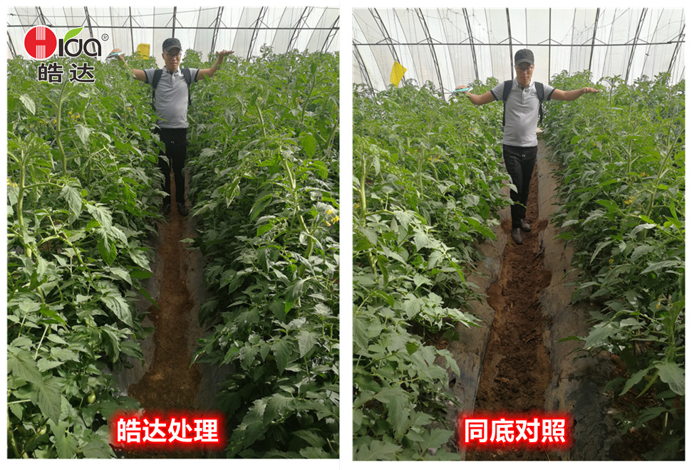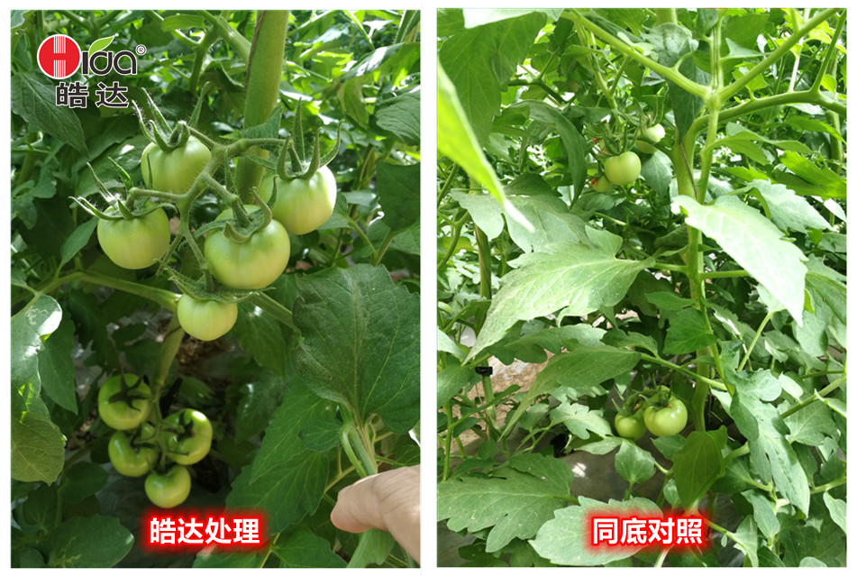 施肥时期:膨果期 时期问题: 果实膨大慢,干物质不易积累,果实硬度不够,易早衰; 施肥方案:叶喷+滴灌 叶喷:皓达功能肥1000倍(30-50mL/亩)+皓达钙镁肥500倍(50-100mL/亩) 滴灌:皓达功能肥100-200mL/亩+皓达钙镁肥100mL/亩(随大肥)施肥效果: 增加干物质积累,快速促进果实膨大,大大降低脐腐病的发病率,防早衰、提高果实硬度,耐储运。