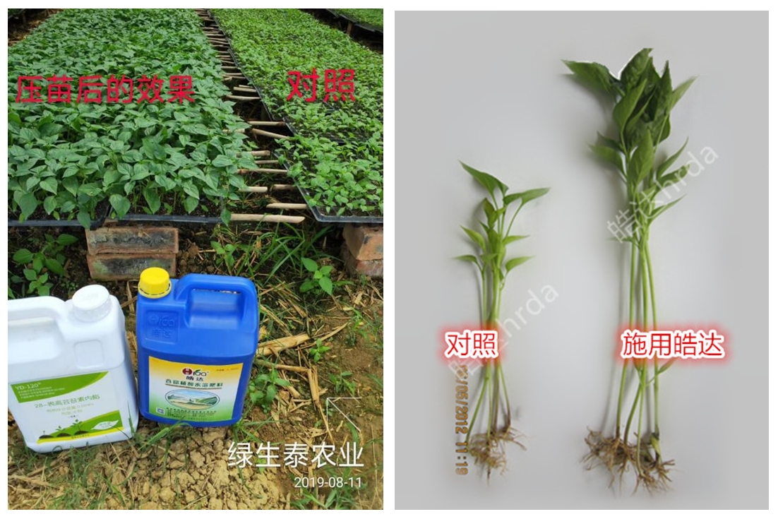 施肥时期:苗床控旺 时期问题: 苗弱,根细,抗逆性差; 施肥方案: 叶喷:(建议使用2次,间隔7-10天喷1次) 皓达功能肥200倍(100mL)+皓达锌500倍(50mL)(20kg水) 施肥效果: 根系发达,节间短,茎粗壮、叶厚绿。