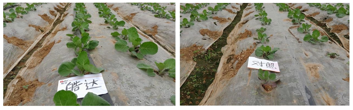 施肥时期:莲座期(定植后15~20天15片真叶) 时期问题: 植株不够健壮、徒长,叶片发黄,根系差,茎杆细弱; 施肥方案:叶喷+滴灌 滴灌:皓达功能肥1000倍(1kg/亩)(随高氮复合肥) 叶喷: 1、蹲苗促根:定植后10-15天进行蹲苗 皓达功能肥200倍(300mL/亩)叶喷(单打,不加农药) 2、促长缓药害:皓达功能肥1000倍(30-50mL/亩)+皓达锌1000倍(30-50mL/亩)+皓达硼1000倍(30-50mL/亩) 施肥效果: 促进叶片快速生长厚绿,根系发达,缓解除草剂对叶片的伤害。结合蹲苗管理,为形成坚实的叶球打好基础。