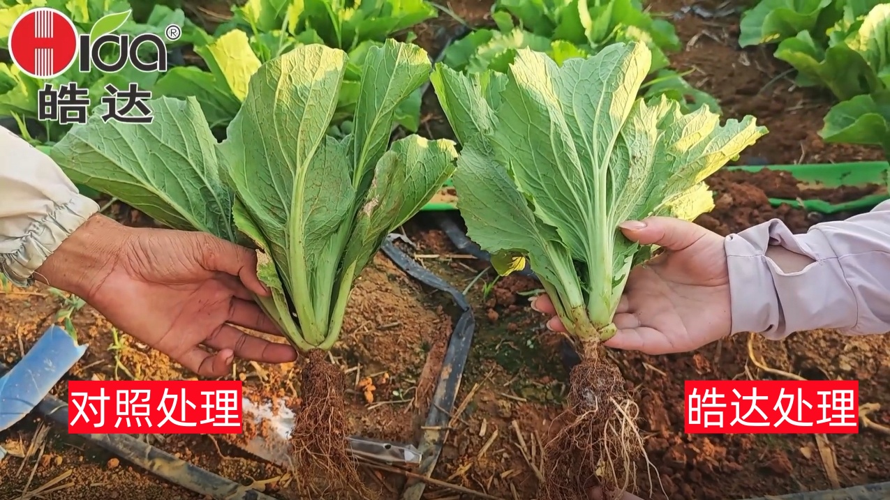 从下图中可以看到皓达处理的芥菜根系较对照的白根多,活力旺盛。芥菜施用皓达肥能改善土壤环境,促进根系生长,更好吸收营养。