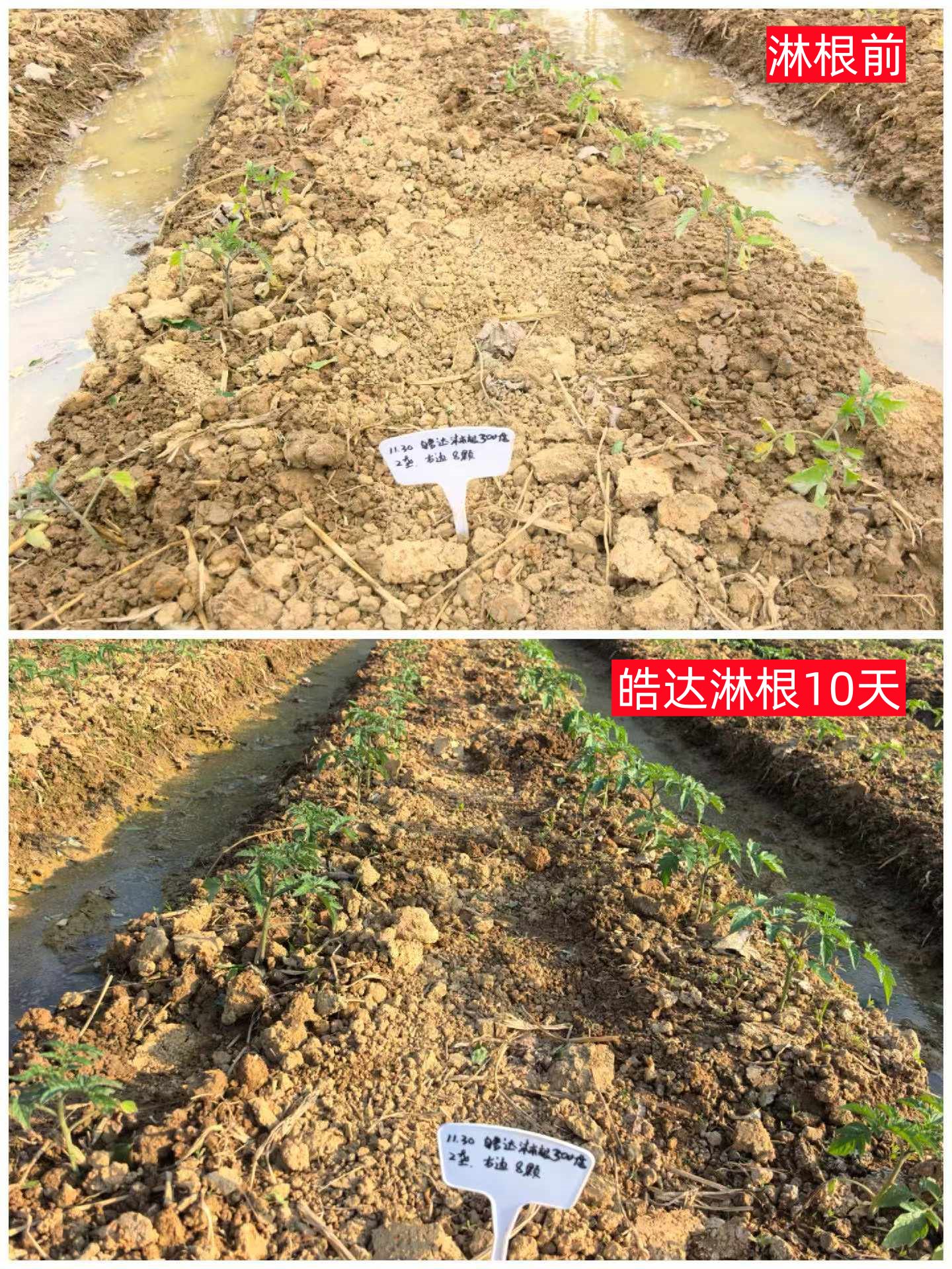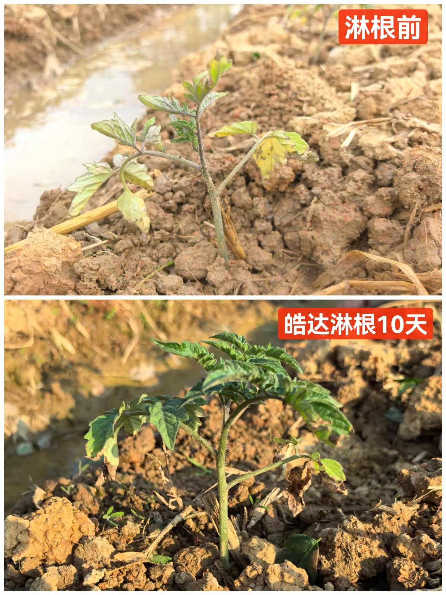 广西桂平蒙圩镇全老板移栽后的番茄缓苗慢、加之土壤板结、低温霜冻造成黄苗严重,于2025年11月30日使用皓达300倍液定根水,12月9日(施用皓达定根水10天)回访番茄缓苗成功、长势兴旺。