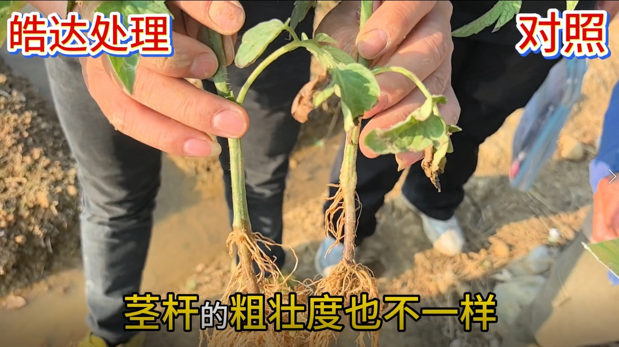 2、皓达处理的番茄茎秆较对照更粗壮。